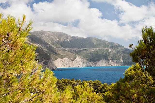 A vyrážíme na celodenní výlet napříč celým ostrovem z jeho jižního cípu na severní.....první zastávka je na snad nejznámnější pláži Kefalonie- Myrtos . Je to jedna z pláží, kde se natáčela Mandolína kapitána Corelliho.